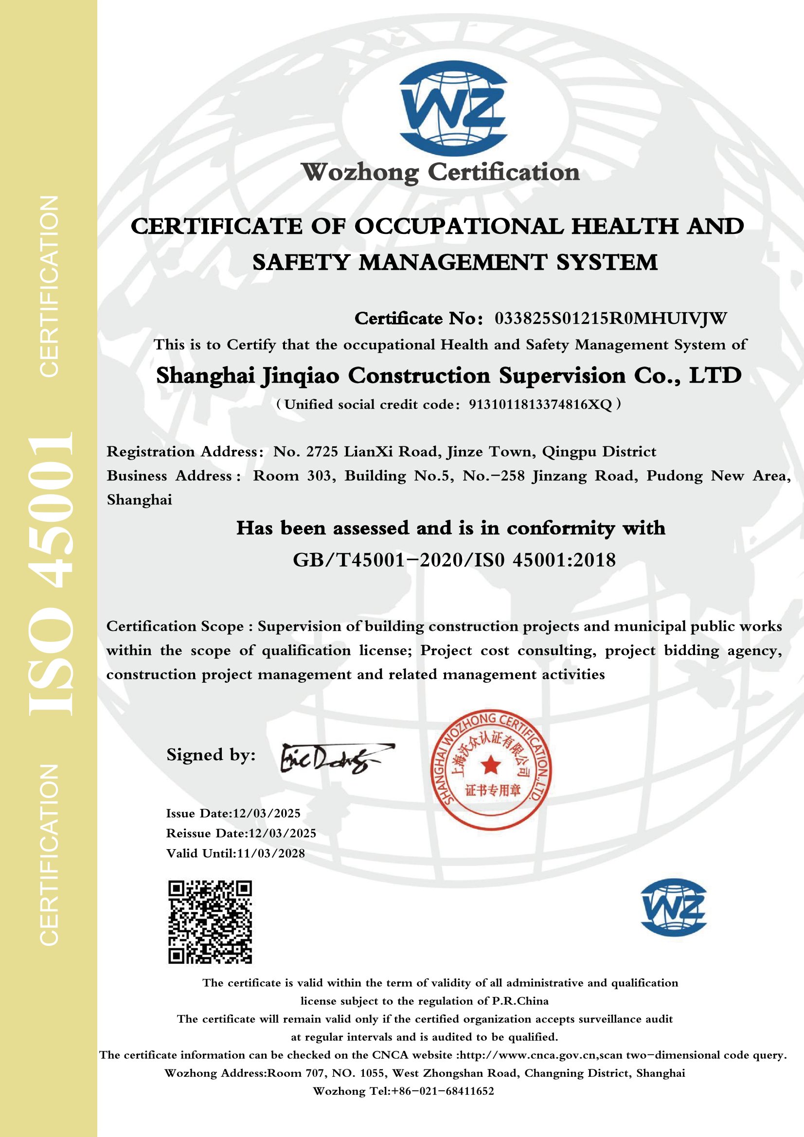 2025年ISO45001职业健康安全管理体系认证证书(英文...